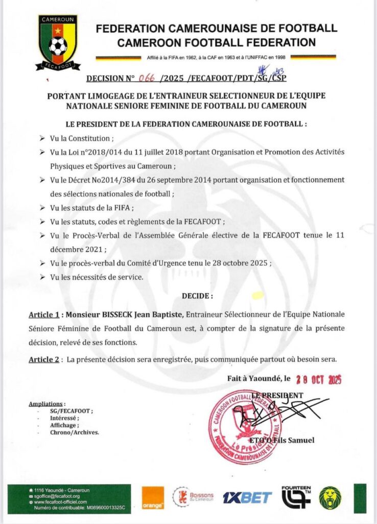 Jean Baptiste Bisseck n’est plus l’entraîneur des Lionnes indomptables de football depuis hier mardi. Ainsi en a décidé la fédération camerounaise camerounaise de football. Son président, Samuel Eto’o, a rendu public une décision qui relève de ses fonctions, le technicien Camerounais.