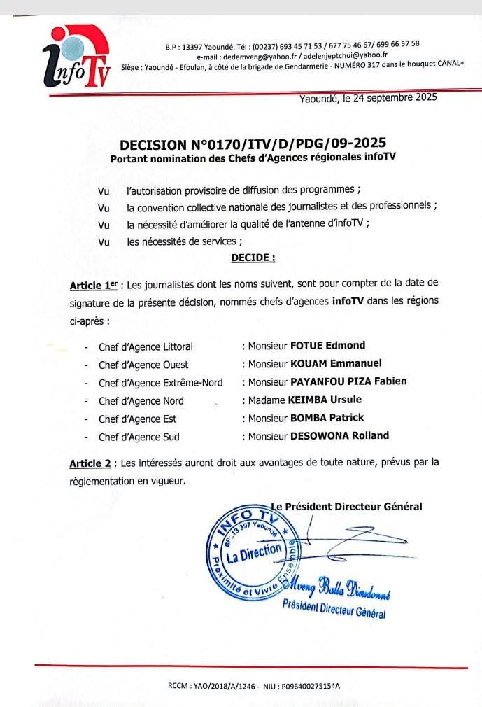 À l’Ouest la haute hiérarchie de Info TV a fait confiance à Emmanuel Kouam. Alors que dans le Sud, Dieudonné Mveng a nommé Desowona Rolland. La même décision nomme Payanfou Piza Fabien, Kiemba Ursule, et Bomba Patrick, respectivement à la tête des régions de l’Extrême-Nord, du Nord et de l’Est.