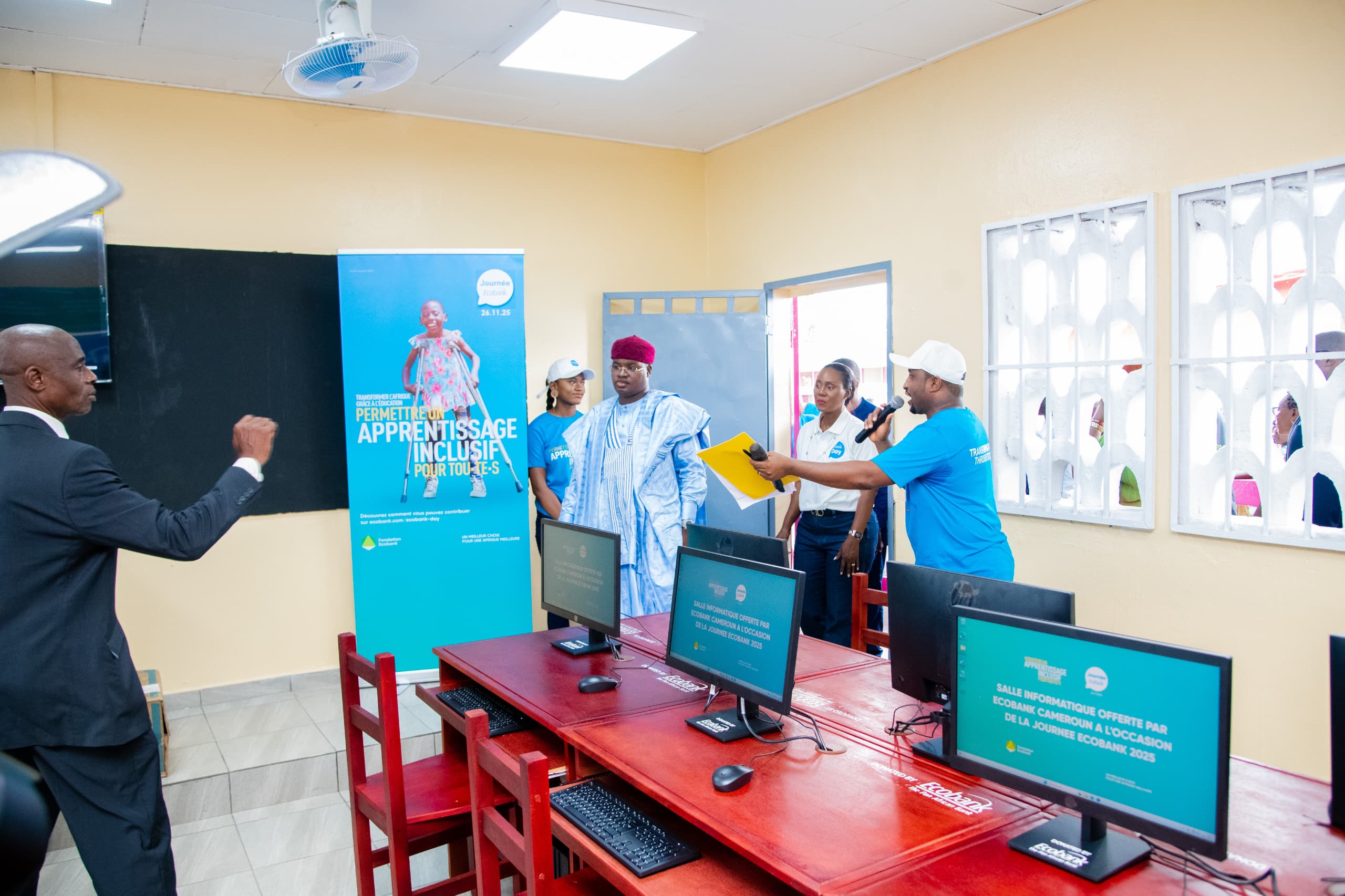 Les élèves de l’école publique inclusive de Bali à Douala peuvent désormais surfer, se familiariser avec internet et développer des compétences avec l’intelligence artificielle. Cette connexion, ces jeunes la doivent à Ecobank Cameroun. La filiale du groupe bancaire panafricain, a doté leur établissement scolaire d’un laboratoire informatique moderne et entièrement équipé. La remise de ce don a eu lieu mercredi, 26 novembre 2025. C’était au cours d’une cérémonie tenue en présence des responsables de Ecobank Cameroun, des autorités administratives et traditionnelles, des responsables de cette école.