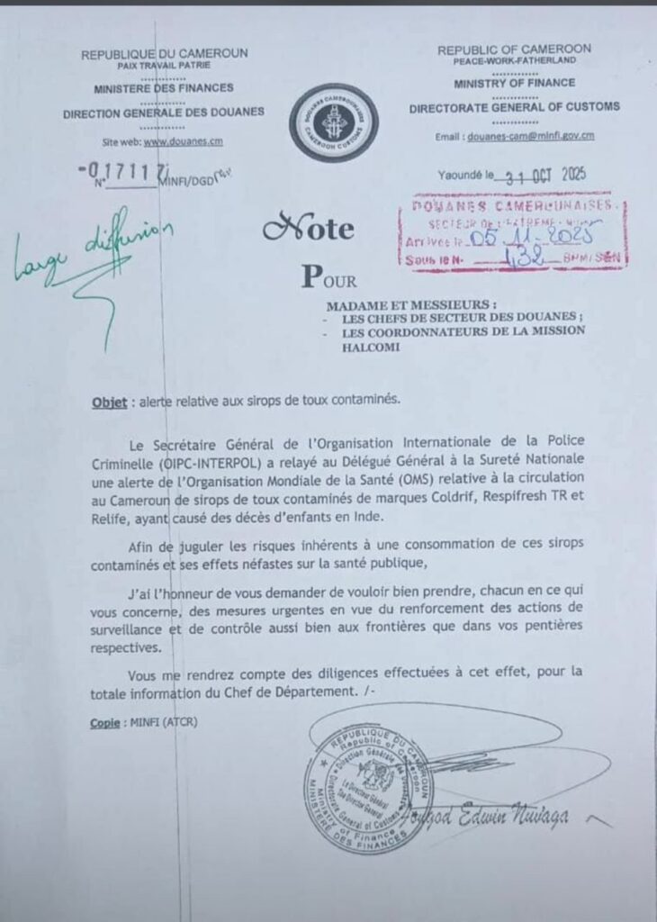 Des sirops contaminés contre la toux sont en circulation au Cameroun. Il s’agit des marques Coldrif, Respifresh Tr et Relife. Ces jus infectés ont déjà causé la mort de plusieurs enfants en Inde.